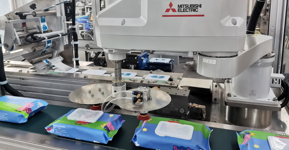 本機使用三菱機器人高剛性機械臂,視覺識別技術、傳送帶跟著技術等完美結合。在線可以完成自動取蓋、貼標、涂膠、粘蓋等一系列動作,更換蓋子規格時,在觸摸屏操作切換。節省人力,從而降低用工成本。極大地提高生產效率和產品合格率。